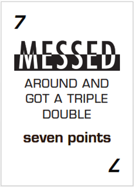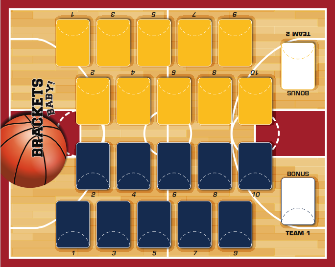 Each player will alternate possessions, in which they are dealt a card from their respective decks and placed face up on the Game Mat in the Possession order (1-10). We will keep a running score of the possessions, and then after each team has been dealt their 10 respective cards, we will deal one card each from the Bonus Deck, that has higher scoring possibilities (1 – 8 points possible).
