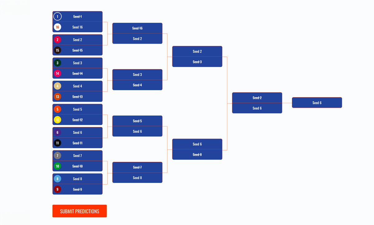 To submit your entry, you simply need to visit the “Submit Predictions” page, register (or log-in if you’ve already created an account), and then select a winner prediction for each round (Round of 16, round of 8, round of 4, and round of 2) in the bracket until you’ve chosen a final champion.